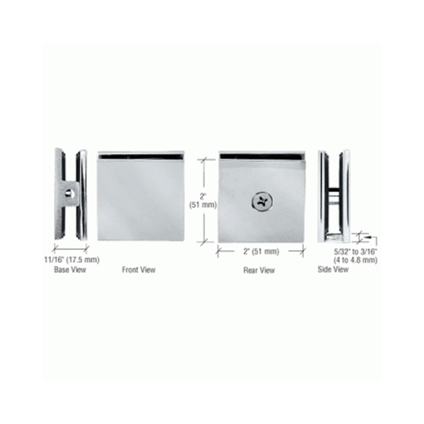 Our BB Hardware Square Wall Mount Clamp (Hole-in-Glass Style) mount directly to the wall, ceiling or floor to secure vertical fixed glass panels. Clearance between the glass and wall is 3/16″ (5 mm). Clear silicone can be used to provide a clean, water-tight seal.